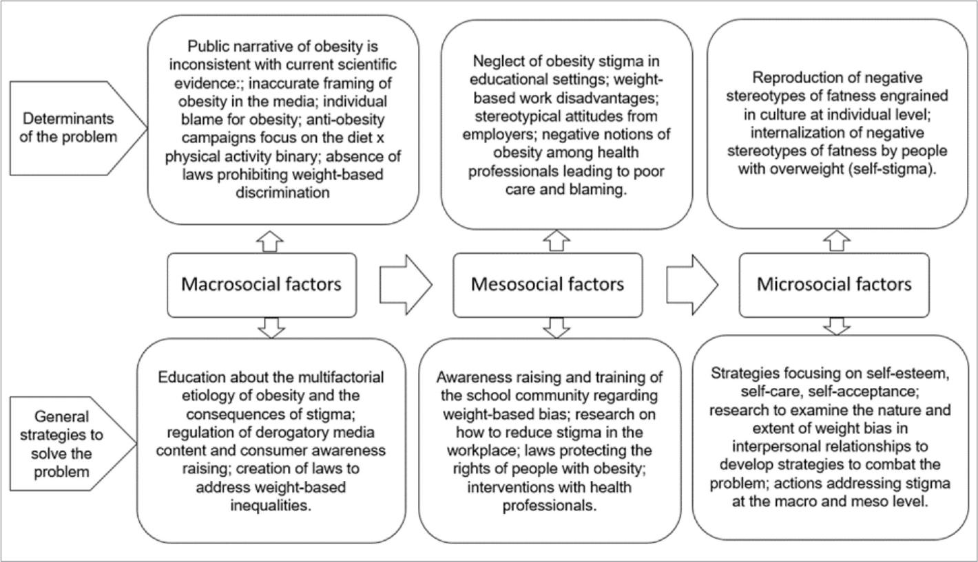 Obesity stigma is influenced by the complex interaction of factors at the macro, meso and micro levels. With regard to macrosocial factors, part of a complex web of moral norms, weight stigma is historically, culturally and politically created and embodied by society (Setchell et al., 2017). Stigma is influenced by various narratives that converge towards practices and discourses, such as: (1) the social context, which involves the production of truths about what is deemed normal and abnormal; (2) the influence of the media on opinions in the social context; (3) scientific discourse and the assumption that body weight is entirely controllable; (4) the political context, which denies the negative influence of stigma on efforts to address obesity; and (5) the absence of legislation prohibiting weight-based discrimination.