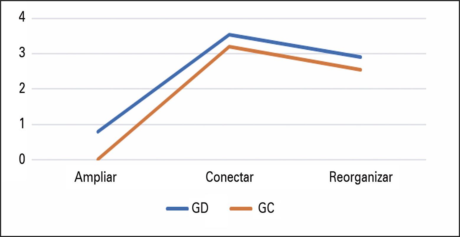 Os resultados acima revelaram que não houve diferença significante entre os grupos GD e GC nos testes da ampliação do campo mental (p≥0,05), que demonstrou pouca geração de ideias e perspectivas. Nos testes de conexão houve diferença significante (p<0,05), apresentando maior desempenho dExemplo de uma das questões do subteste:e combinação incomum de ideias no GD. Na reorganização do campo mental, também o GD considerou um maior número de elementos para além de um contexto específico e alterando pontos de vista (p<0,05).