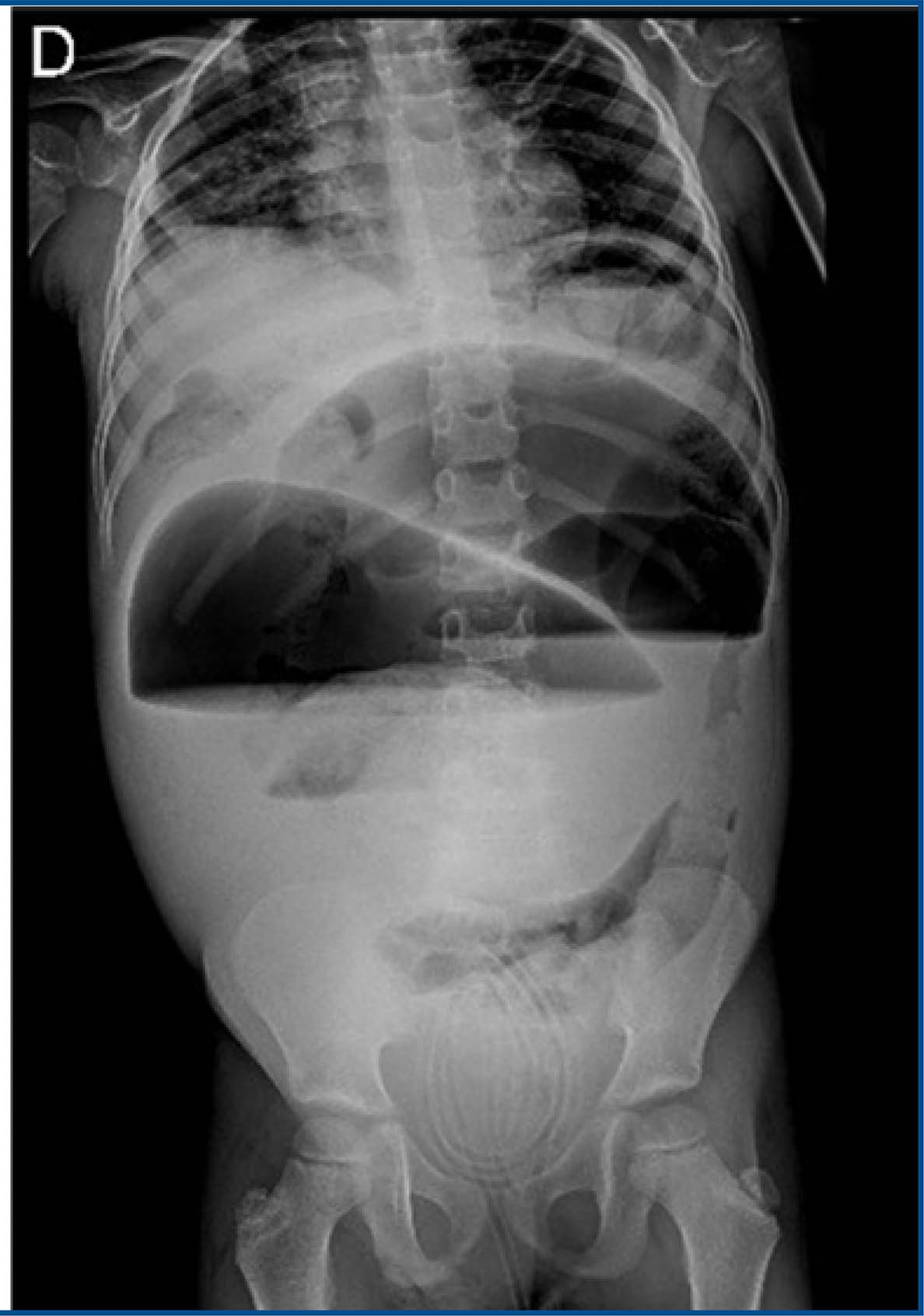 Although hemodynamically stable, the patient continued to report intermittent abdominal pain. On physical examination, the abdomen was tense, with no rebound tenderness. Given these findings, a follow-up upright abdominal X-ray was ordered (figures 2 and 3), as the initial supine bedside X-ray showed no significant abnormalities.