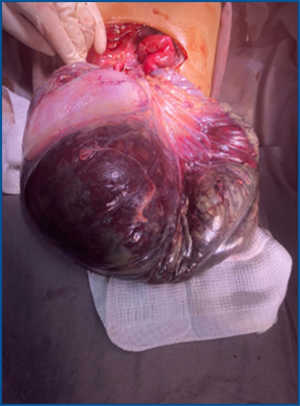 The follow-up imaging revealed the “coffee bean” sign, leading to a sigmoid volvulus diagnosis. Surgical intervention was deemed necessary, and an exploratory laparotomy was performed. This confirmed the presence of a volvulus with three complete twists, accompanied by necrosis of the entire sigmoid colon, though without perforation (figure 4). The volvulus was successfully untwisted, and the necrotic sigmoid segment was resected. The distal rectal stump was amputated, and a Brooke colostomy was created. The procedure was completed without complications.