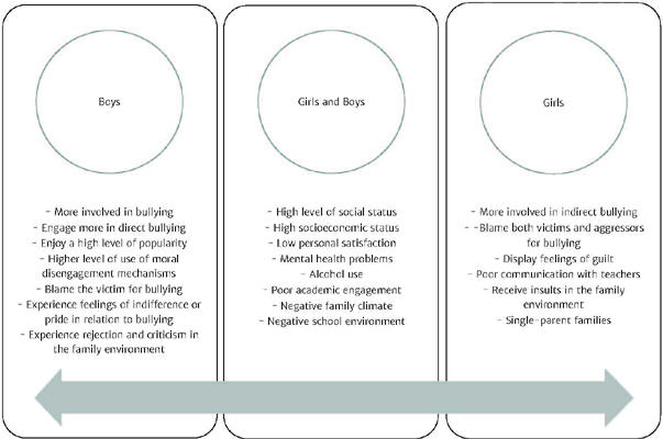 Studies also showed that bullies had a negative perception of the family environment, which was marked by parental rejection and criticism (Estévez, Jiménez, & Moreno, 2018; Leóndel-Barco et al., 2015). Boys were more likely to receive parental criticism (León-del-Barco et al., 2015), while girls tended to receive insults (Garcés-Prettel, Santoya-Montes, & Jiménez-Osorio, 2020). Furthermore, girls who lived with neither of their parents were more likely to be aggressors than other girls (Silva-Rocha et al., 2019). Boys also tended to score higher than girls for moral disengagement mechanisms (Bjärehed et al., 2020). Concerning emotional expression, female aggressors tended to feel more guilt, while male aggressors reported feelings of indifference and even pride (Romera, Ortega-Ruiz, Rodríguez-Barbero, & Falla, 2019b). Figure 2 synthesizes the main characteristics of boys and girls who engage in school bullying.