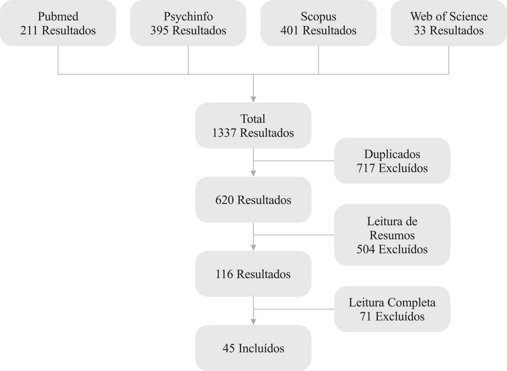 Foram incluídas nesta revisão 45 produções, conforme ilustrado em maior detalhe pela Figura 1. No total foram excluídos 575 estudos, tendo em sua maioria (405) a incongruência com o tema da revisão como causa de exclusão. Com o intuito de viabilizar a leitura objetiva e clara, os principais dados coletados estão resumidos a seguir4.