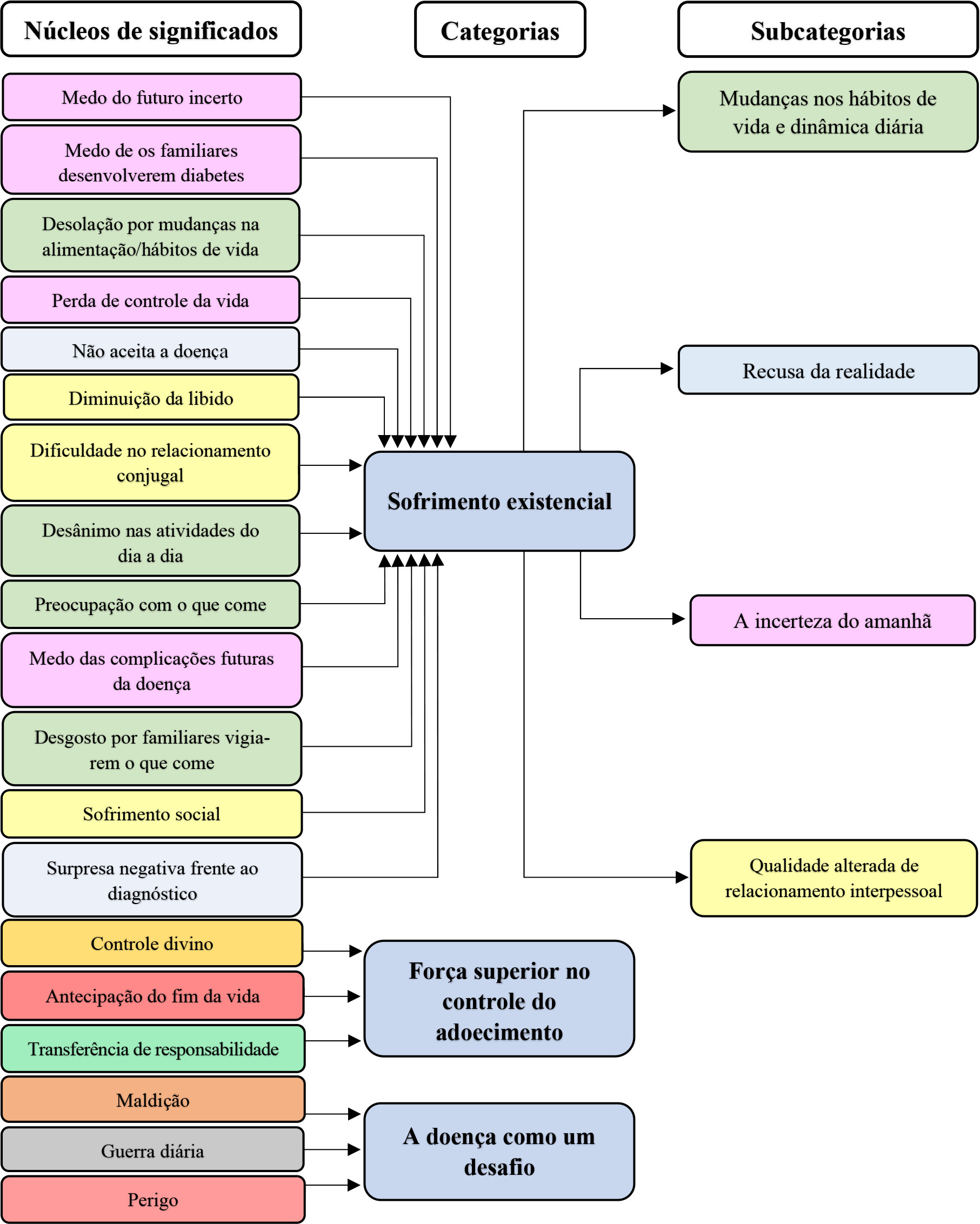 Os núcleos de significados que foram interpretados como sofrimento existencial emergiram nos discursos de todos os entrevistados. O tema da segunda categoria foi abordado por sete pessoas, enquanto quatro participantes mencionaram a doença como um desafio.