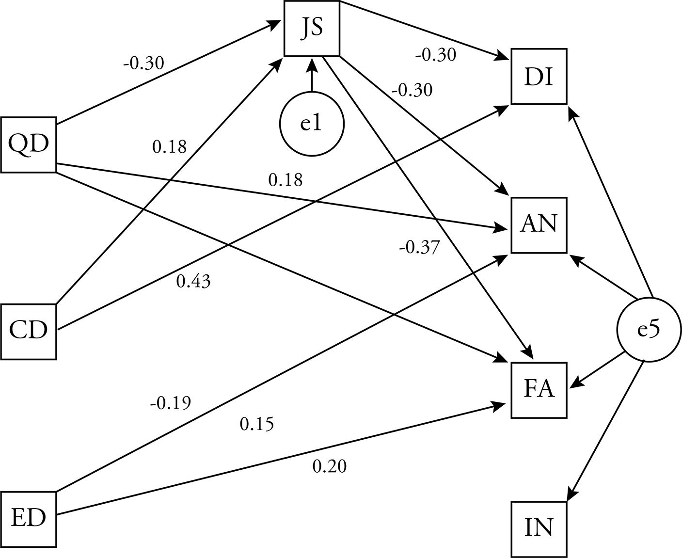 Considering that the variable Job satisfaction was present in the four models, this variable was used to investigate its mediation effect between the demands (Quantitative, Cognitive, Affective) and the four dimensions of technostress (Disbelief, Fatigue, Anxiety, Ineffectiveness). The same strategy was used for the four models. Initially, a model was proposed with all possible effect relationships, encompassing both direct effects of the three demands on the dimensions of technostress and effects mediated by Job satisfaction (full model). The effects of each model were then evaluated and removed according to the highest p-value until only significant effects remained (final model), as shown in Figure 1. It was possible to observe that mediation occurs in relation to quantitative and cognitive demand in the dimensions of Anxiety, Fatigue and Disbelief.