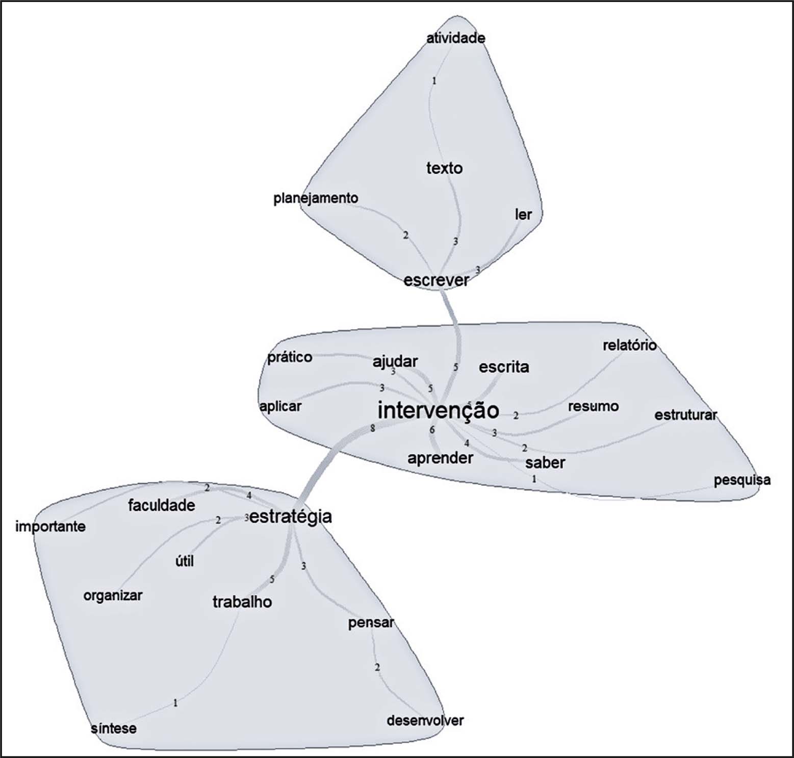 A representação gráfica das percepções dos participantes sobre o módulo de produção escrita pode ser observada na Figura 1. Nela, os vértices maiores indicam as palavras com maior número de frequência e as arestas, linhas de diferentes espessuras, representam as ligações e co-ocorrências entre as palavras evocadas. Assim, pode-se observar que os termos “intervenção”, “estratégia” e “escrever” ocuparam uma posição central e interrelacionada nos discursos dos sujeitos, indicando como, ao longo da intervenção, eles se remeteram às estratégias de escrita aprendidas.