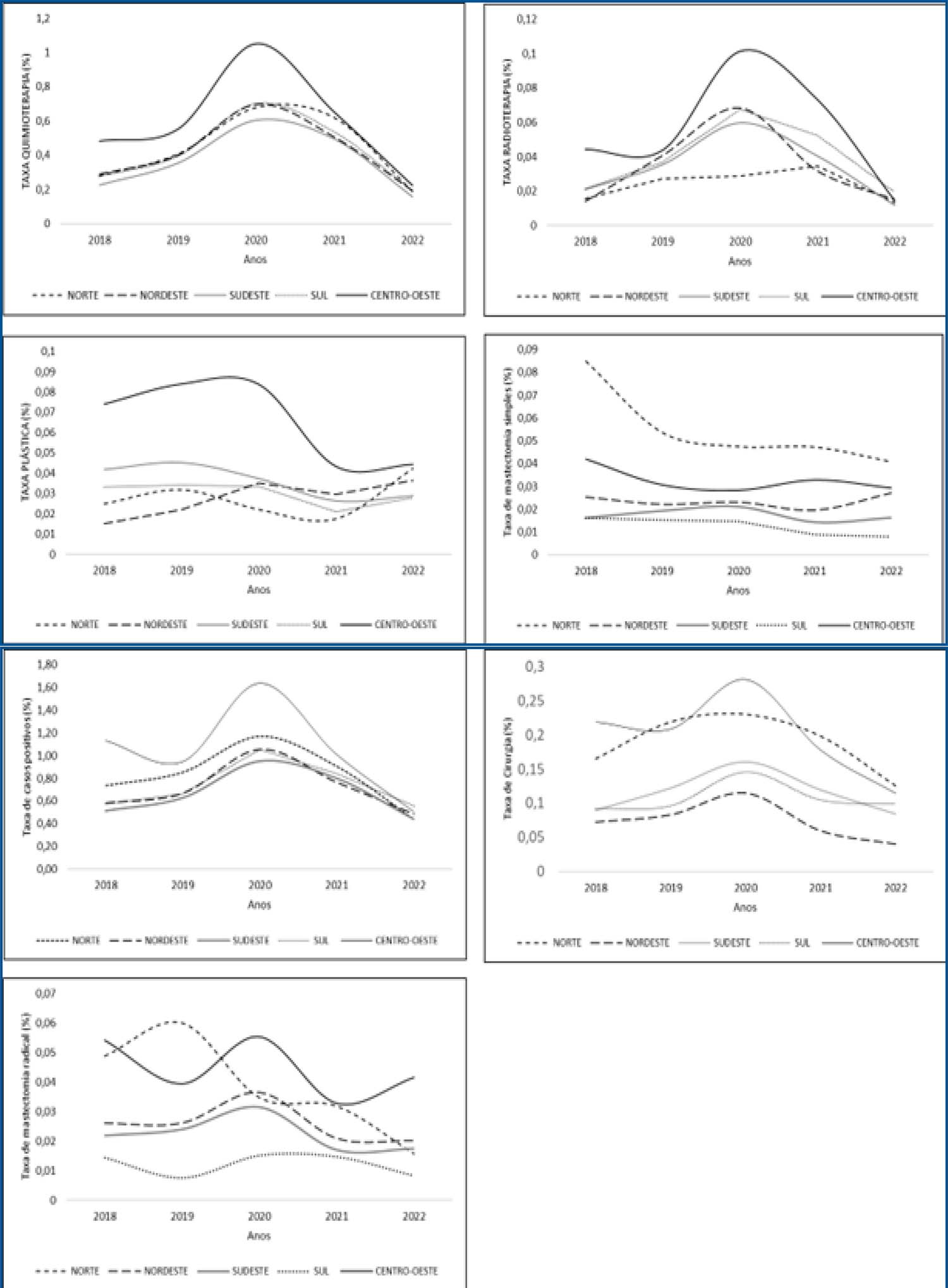 The rate of radical mastectomy (g) suffered the greatest variations in the North region in the period 2018-2022. From 2019 onwards, the mastectomy rate in the North region progressively declined, going from 0.06% (the highest in the country in 2019), to 0.01% in 2022. The South region continued to have the lowest rates for this procedure since 2018, followed by the Southeast and Northeast regions. These three regions (South, Southeast and Northeast) showed an increase in the radical mastectomy rate in 2020, returning to the percentages at the beginning of the study in 2022. The Central-West region had its radical mastectomy rate reduced from 2018-2019, showing the highest rate in the country in 2020, declining in 2021 and rising again in 2022, following the trend of a higher rate of radical mastectomy among regions in Brazil.