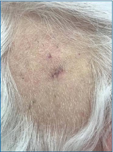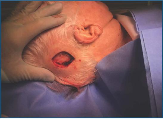 Refere que procurou pelo cirurgião apresentando lesão tumoral em região occipital à direita de couro cabeludo, com aproximadamente 1cm de diâmetro e com margens mal definidas (figura 1). História de cirurgia prévia para a retirada de um tumor desta região dois anos antes. Consta em seu prontuário o laudo da anatomia patológica desta intervenção prévia que mostrava o diagnóstico de adenocarcinoma mucinoso bem diferenciado com margens coincidentes. Em nota o patologista recomendava que fosse realizado estudo imuno-histoquímico para distinguir entre carcinoma mucinoso de glândulas sudoríparas primário da pele e neoplasia metastática, porém não há registros que isto tenha sido realizado na época.