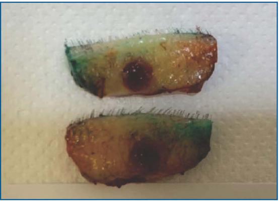 Agora, na presença da recidiva da lesão, foi solicitado exame de ultrassonografia de cabeça e pescoço para estadiamento que não mostrou nenhuma alteração. Após este estadiamento a paciente foi operada em ambiente hospitalar para a retirada da lesão com margens (figura 2) e com a realização de exame de anatomia patológica per-operatória (exame de congelação) para avaliação das margens cirúrgicas.