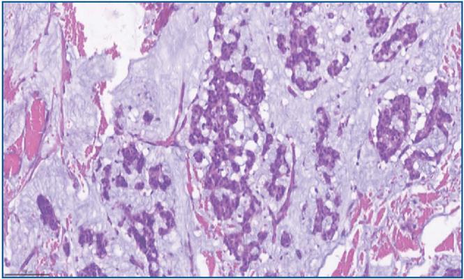 Figura 4 Células neoplásicas atípicas em agrupamentos coesos sólidos em meio a abundante mucina extracelular
