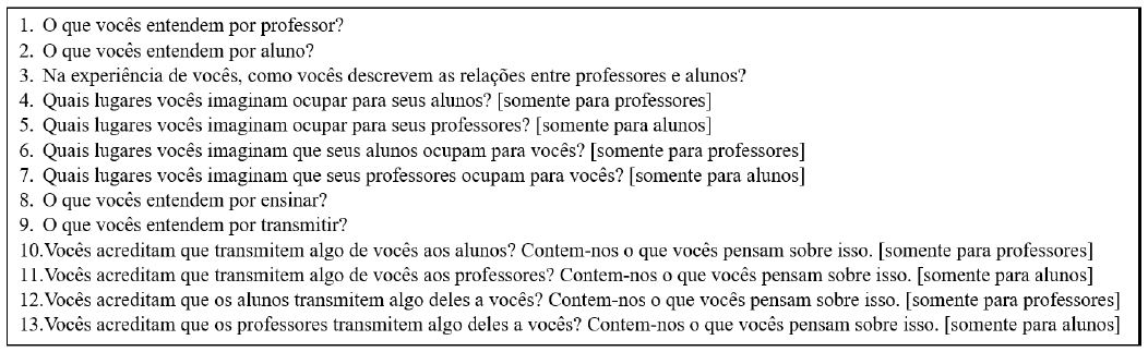 Utilizou-se um roteiro semiestruturado que continha treze questões abertas, intimamente alinhadas com os objetivos gerais e específicos do estudo, conforme descrito na Figura 1. Vale destacar que este roteiro também foi pensado em função dos fundamentos da teoria psicanalítica, especialmente no que se refere ao conceito de transferência, cujas questões de número 4 a 7 objetivaram ensejar.