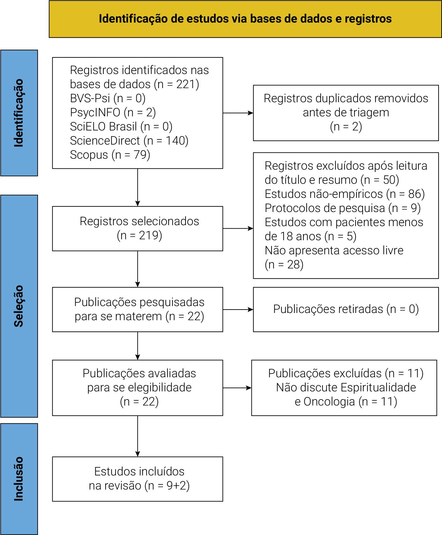 Após as buscas efetuadas nas bases de dados, inicialmente, foram identificados 221 estudos potencialmente relevantes para o estudo, com a eliminação de dois duplicados, restaram 219. Na fase de análise dos títulos e resumos, 50 artigos foram excluídos por não abordarem a temática, enquanto outros 86 estudos foram descartados por se tratarem de pesquisas teóricas, monografias, teses e dissertações. Outras 28 publicações estavam em plataforma restritas, não estando disponíveis em acesso aberto, nove eram protocolos de pesquisa e cinco tinham um público-alvo distinto. Como resultado, restaram 22 artigos elegíveis, dos quais 12 foram excluídos devido a não abordarem diretamente a relação entre espiritualidade e Oncologia. Portanto, a amostra final foi composta por dez artigos. O Fluxograma apresentado na Figura 1 detalha as etapas do processo de obtenção da amostra.