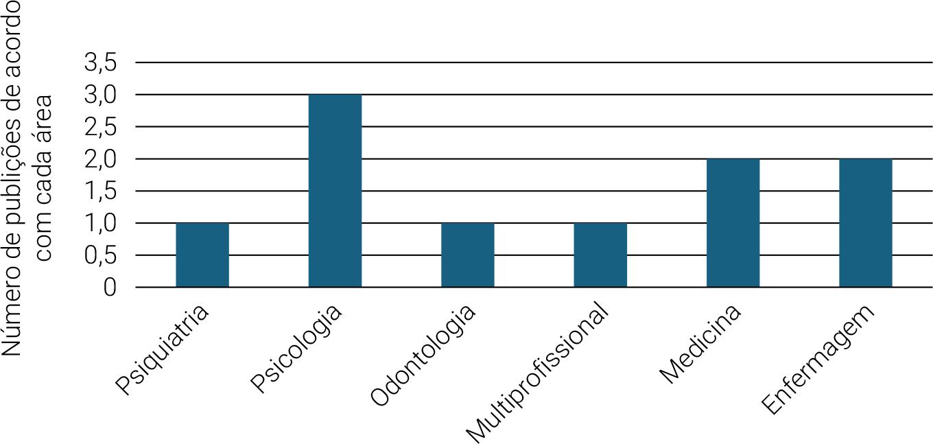 Em relação a área de concentração dos artigos, verificou-se a maior prevalência em periódicos na área da Psicologia, com três artigos. As revistas de Enfermagem e Medicina contaram com duas publicações cada, a Psiquiatria, Odontologia e multiprofissional contribuíram cada uma com um artigo (Figura 3).