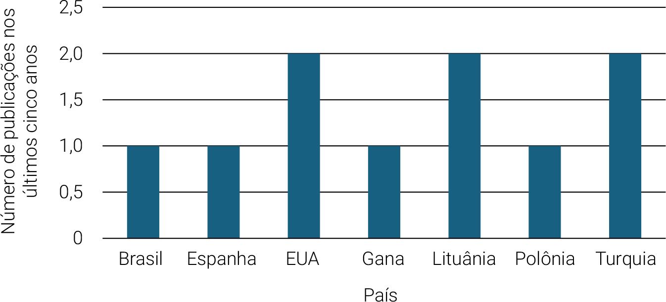 A Figura 4 mostra que, quanto ao país de origem dos artigos publicados, os Estados Unidos da América (EUA), Lituânia e Turquia lideram com duas publicações cada. Além disso, Brasil, Espanha, Gana e Polônia contribuíram com um artigo cada. No que se refere ao idioma, a maioria dos estudos foi publicada em língua inglesa.