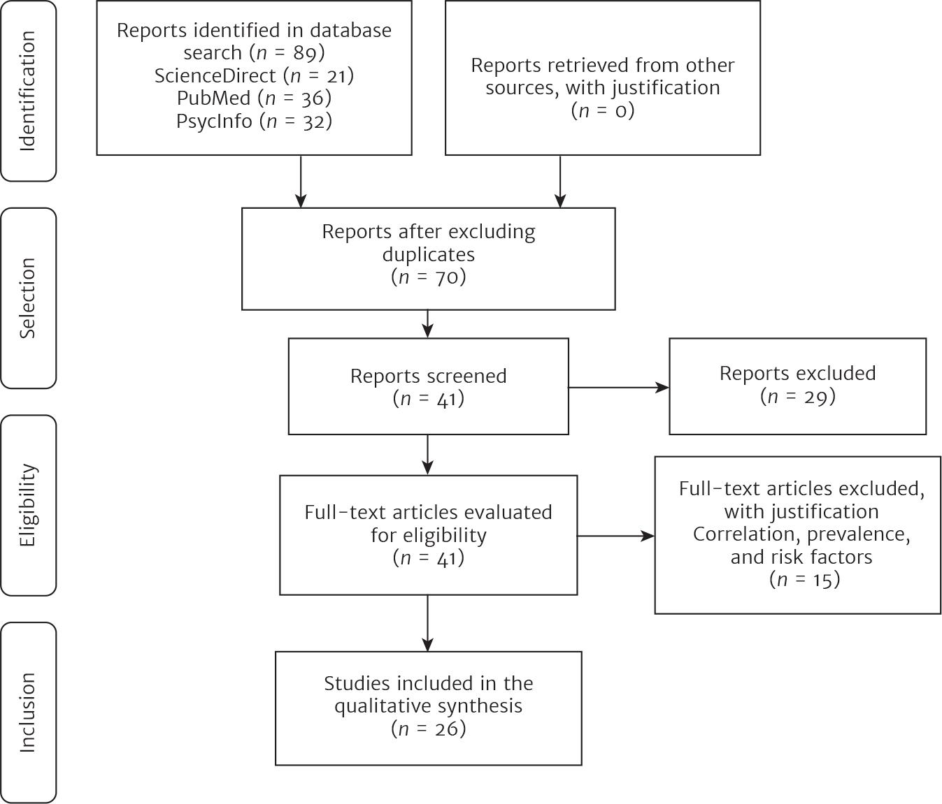 A total of 89 publications were obtained from the databases (Science Direct = 21; PubMed = 36; PsycInfo = 32), 19 of which were excluded due to being duplicates. After reading the abstracts, based on the inclusion and exclusion criteria, 41 works were selected. The complete texts were retrieved, and, after reading them in full, another 15 were excluded as their objectives differed from those this review intended to identify, leaving 26 articles for evaluation. In Figure 1, the flowchart of decisions based on the PRISMA guidelines is presented (Page et al., 2021).