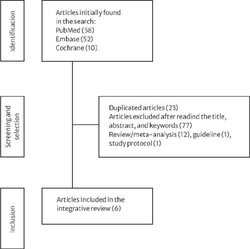 Initially, 120 complete articles were found: 58 articles in PubMed, 52 in Embase, and ten in Cochrane. Of these, 23 articles were excluded because they were duplicated, 77 articles were excluded after reading the title, abstract, and keywords because they were not consistent with the objective of this review, and 12, because they were reviews or meta-analyses, one protocol, and one guideline. Finally, only six articles were selected for full reading.