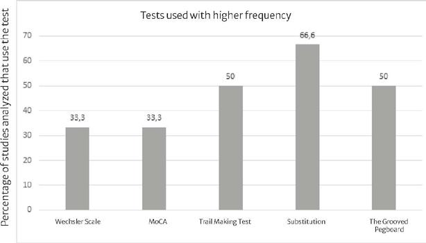 The heterogeneity of the neuropsychological profiles is due, in part, to the different instruments used in the evaluation of these patients. The most used neuropsychological instruments were the following: MoCA, Wechsler’s scales (Wechsler Memory Scale III – WMS-III – and Wechsler Memory Scale – Chinese Revised – WMS-RC), Trail Making Test, The Grooved Pegboard, and substitution (letter-symbol, digit-symbol) (Figure 2). The instruments used in the analyzed studies with lower recurrence were: MMSE, sentence-free recall, Fluency A, Fluency B, Verbal Fluency (F, A, S), Fluency Professions, free word recall, Stroop Word, Interference Test, Rey’s Complex Figure (copy, immediate, and posterior recall), the recall part of the number-symbol pairs (Digit-Symbol Substitution [DSST] recall), immediate and late recall of a short story, and Rey’s Auditory-Verbal Learning Test. Only one study reported that Wechsler Intelligence Scale for Children (WISC), Wechsler Adult Intelligence Scale (WAIS), and WMS were adapted for the target population (He et al., 2018).