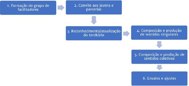 Os três jovens acolheram a ideia, e estabeleceu-se um planejamento global (Afonso, 2015) sobre quais seriam os procedimentos para a realização da oficina de composição musical. Conforme mostra a Figura 1, foram planejadas seis etapas.