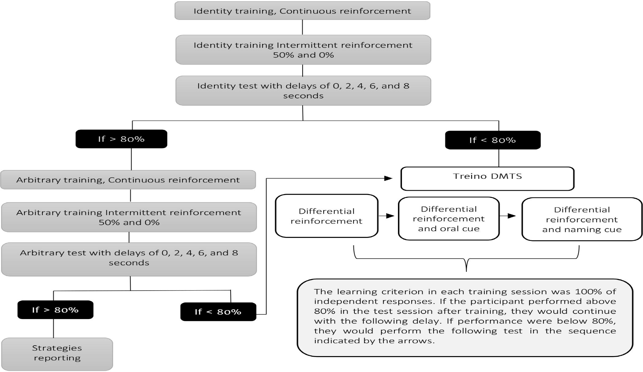 After this stage, the teaching of arbitrary relations began via MTS and tests with DMTS, with delays (0, 2, 4, 6, and 8 seconds). If the participant did not meet the criterion (80% of correct answers) in the tests, the procedure was the same as the one used to teach the identity relationships. At the end of the procedure, each participant was asked which strategy they used. Figure 1 presents the sequence of steps in the general procedure.