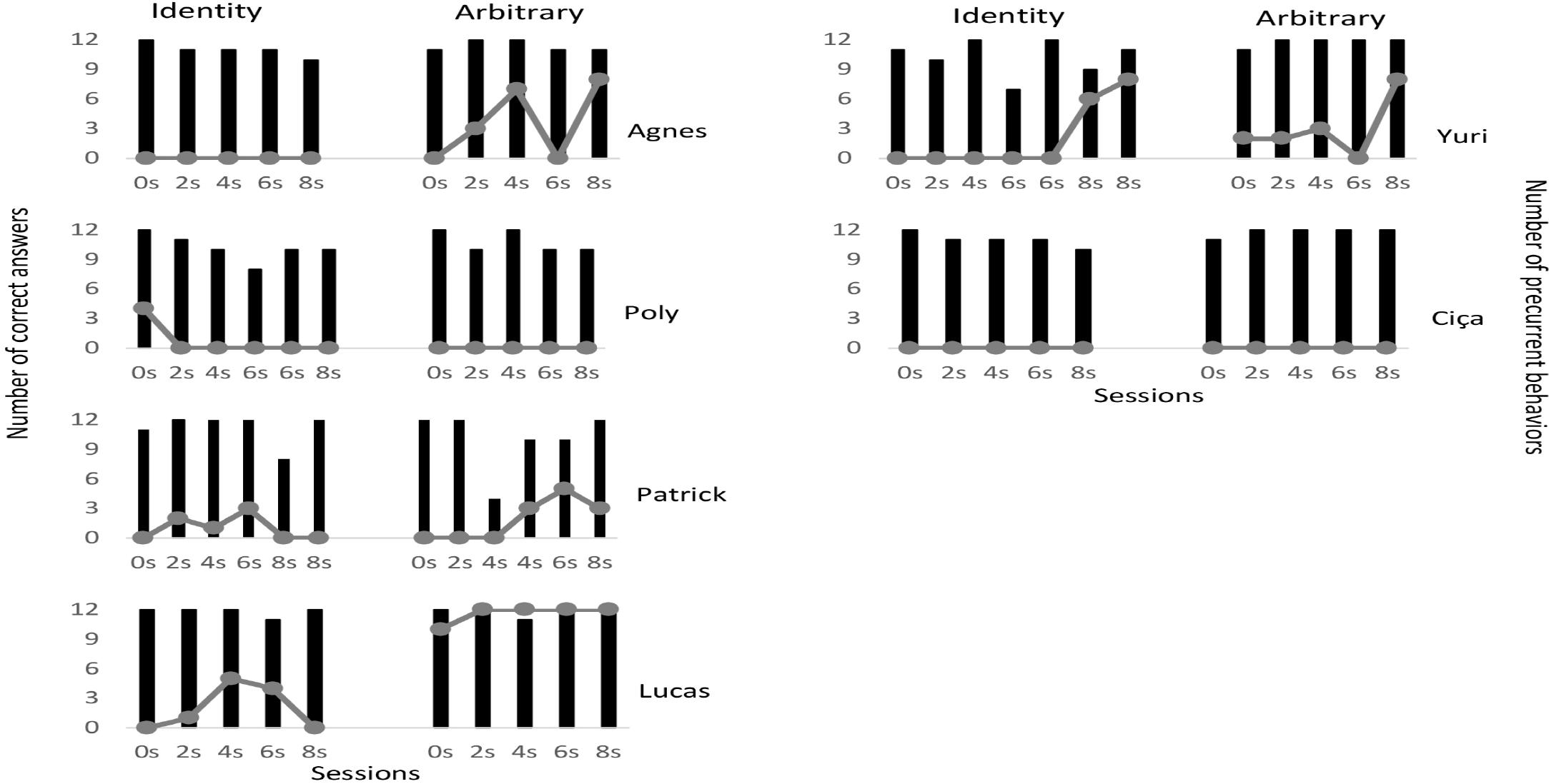 Considering the relevance of precurrent behavior in matching tasks according to the delay sample, public behaviors with characteristics of precurrent behaviors (e.g., saying “FFFF” when dealing with an abstract stimulus) during the testing sessions were analyzed. Figure 3 shows the performance of the seven participants concerning the number of precurrent behaviors emitted during the tests. In general, all participants, except for Ciça (ID), publicly engaged in precurrent behaviors at some point during the DMTS tests. Participant Agnes (ASD) did not publicly present any precurrent behavior in the tests on identity relationships. However, she did it for the tests with a delay of 2, 4, and 8 seconds for the arbitrary relationships. For example, in the test session with a 2-second delay, the participant said: “Are those glasses?” Poly (ASD) publicly presented four precurrent behaviors in the first identity relationship testing session but did not present them in the remaining sessions. In the session with a 0-second delay, she said the following when facing stimulus A1: “This is F.” Patrick (ASD) presented precurrent behaviors for delays of 2, 4, and 6 seconds for the identity and arbitrary relationships and in the tests for identity relationships; and for arbitrary relationships in the 4, 6 and 8-second tests. Such behavior was more frequent in this type of task. Participant Lucas (ASD) publicly presented precurrent behaviors in most testing sessions, though not in the first test session, with 0 seconds. These behaviors were more frequent in the arbitrary relationship tests. In the tests for arbitrary relationships, he publicly presented precurrent behaviors in almost all sessions. For example: “Spiderman with Batman,” and another trial: “Fast with the mad scientist.” Participant Yuri (ID) publicly engaged in precurrent behaviors from the sixth session of the identity relationships test, with an 8-second delay. Engagement was also observed in almost all test sessions for arbitrary relationships, though not in the test with a 6-second delay. For example, when faced with stimulus A1 in the session with an 8-second delay for the identity relationships, the participant said: “Domino,” in another trial, when faced with stimulus A2, he said: “Earthworm.” Again, in the 8-second delay session in the arbitrary relationship, he said: “dog with a ball.”