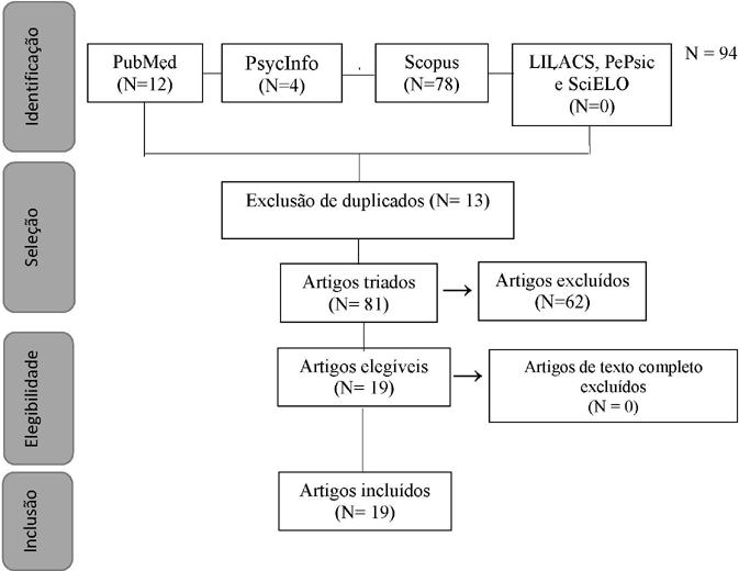Com o término da busca nas bases de dados foram encontrados 94 artigos, sendo 12 no Pubmed, 78 no Scopus, 4 no PsycInfo e zero no SciELO, PePSIC e LILACS. O fluxograma (Figura 1) apresenta as quatro etapas adotadas pelo método PRISMA: identificação inicial, seleção, análise da elegibilidade, conforme os critérios pré-estabelecidos, e inclusão dos estudos para síntese qualitativa.