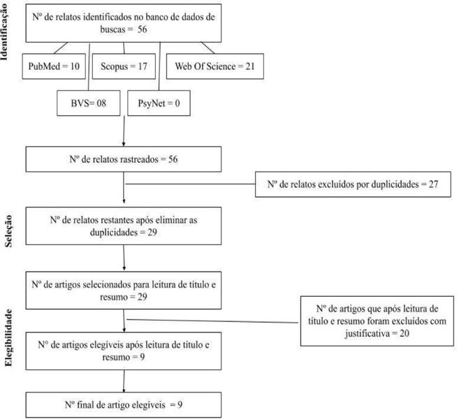Da estratégia anteriormente descrita, foram obtidos 56 artigos: 10 referentes à plataforma PubMed, 17 relativos à base Scopus, 21 da Web of Science, na base de dados BVS foram encontrados 8 artigos, e por fim, na PsyNet nenhum artigo foi identificado. Após excluídas as duplicidades tornaram-se 29. Como critério de exclusão, descartaram-se aqueles que após a leitura de título e resumo não configuraram pertinência temática ao objetivo da pesquisa, restando, assim, 9 artigos. A Figura 1, abaixo, descreve esse processo.