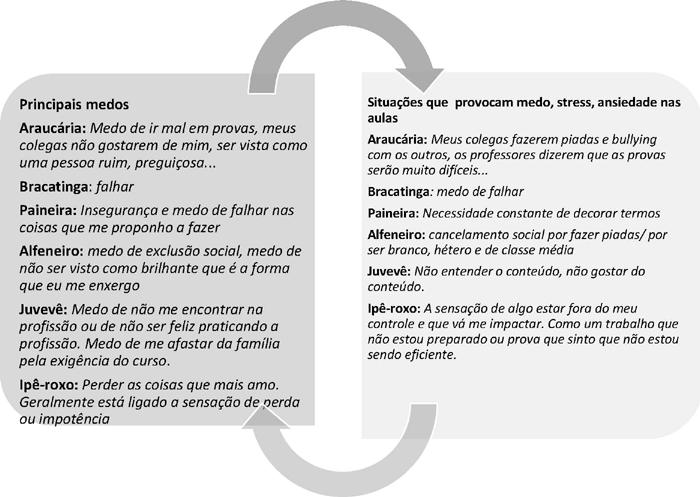 Araucária: As provas, trabalhos e relações sociais; Bracatinga: medo de envergonhar as pessoas que acreditam em mim Paineira: O fato de certas matérias dependerem única e exclusivamente de decorar nomes; Alfeneiro: relacionamento negativo com os colegas, medo de cancelamento social por piadas (medo constante com as falas e de criar inimizades dentro do curso), não conseguir passar sem ficar de final em alguma matéria e assim desperiodizando; Juvevê: Medo do cancelamento, de ir mal nas provas e de não me encontrar na futura profissão. Ipê-roxo: Como estou no início do curso, não sofri muitas pressões, pelo menos na minha visão. Então me sinto muito mais alegre se me comparo ao meu eu de um ano atrás no cursinho. Talvez minha ansiedade seja de não pensar ser suficiente ou que o meu estudo não seja eficiente. |
