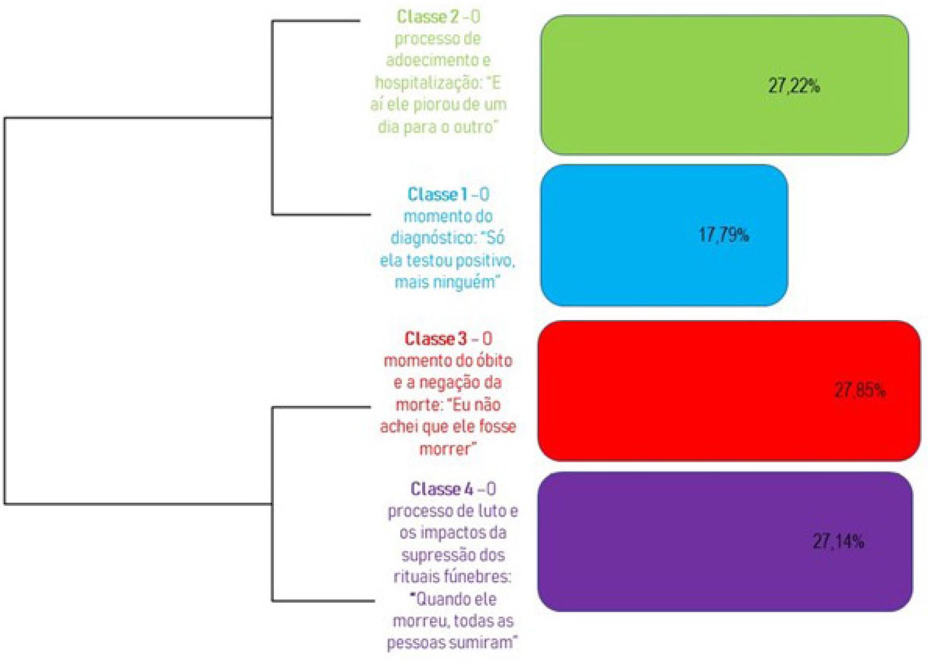 O corpus geral constituiu-se por 23 textos, separados em 1.823 segmentos de texto (ST), dos quais 1.422 STs (78%) foram utilizados no texto. O conteúdo analisado foi agrupado em quatro classes, nomeadas com base nas evocações identificadas: Classe 1 - O momento do diagnóstico:“Só ela testou positivo, mais ninguém”, com 253 ST (17,79%); Classe 2 - O processo de adoecimento e hospitalização: “E aí ele piorou de um dia para o outro”, com 387 ST (27,22%); Classe 3 - O momento do óbito e a negação da morte: “Eu não achei que ele fosse morrer”, com 396 ST (27,85%); e Classe 4 - O processo de luto e os impactos da supressão dos rituais fúnebres: “Quando ele morreu, todas as pessoas sumiram”, com 386 ST (27,14%) (Figuras 1 e 2).